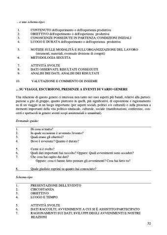 Una relazione di questo genere ci interessa non tanto nei suoi aspetti più banali, relativi alla parteci- pazione a gite di gruppo, quanto piuttosto in quelli, più significativi, di esposizione e ragionamento su di un viaggio in un luogo importante (per aspetti sociali, politici e/o culturali) o sulla presenza a momenti importanti della vita politico-sindacale, culturale, sociale (manifestazioni, conferenze, con- certi e spettacoli in genere aventi scopi assistenziali o umanitari).